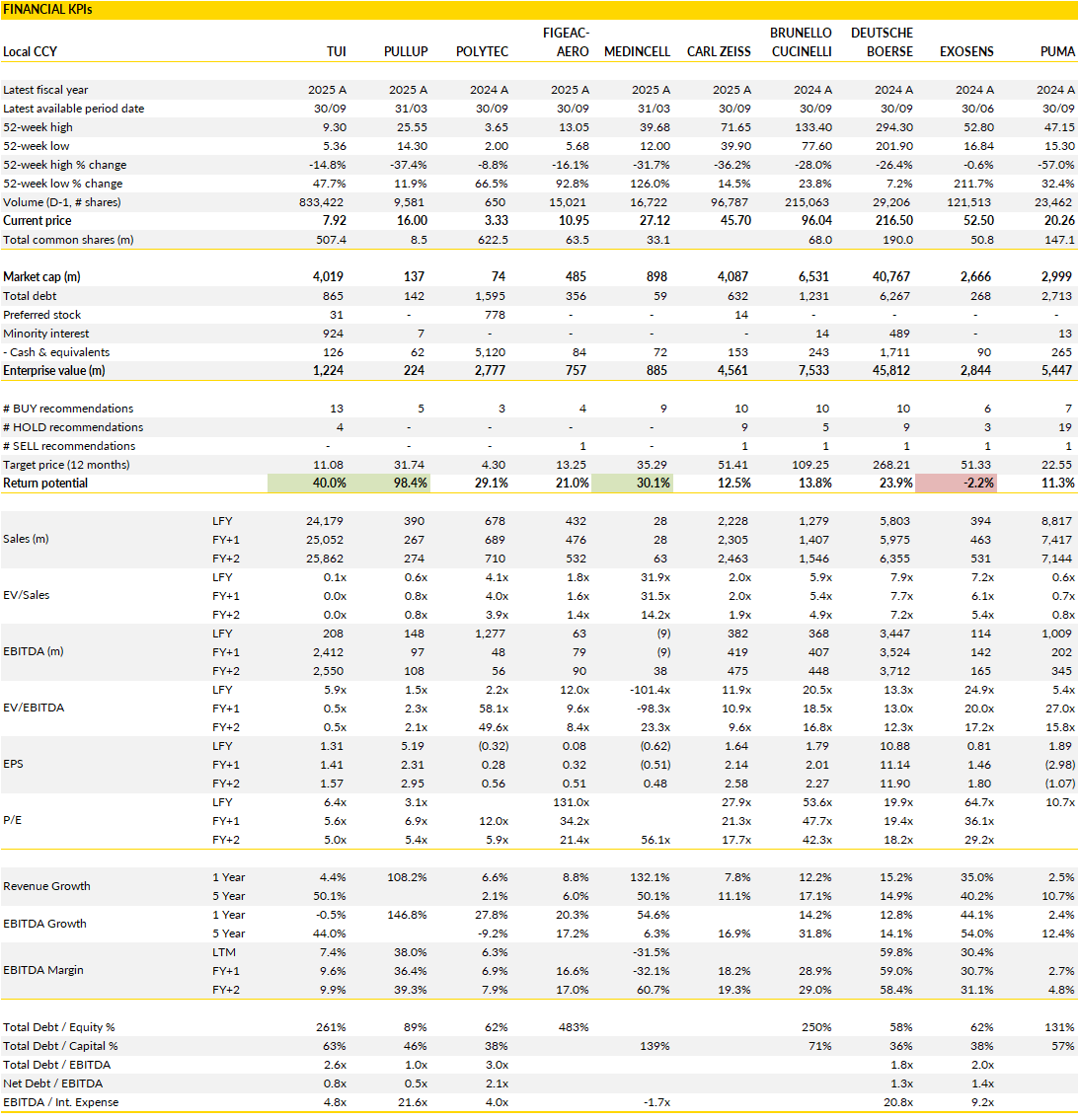 TUI, PulluP Entertainment, Polytec, Figeac Aéro, Medincell, Carl Zeiss Meditec, Brunello Cucinelli, Deutsche Börse, Exosens, Puma