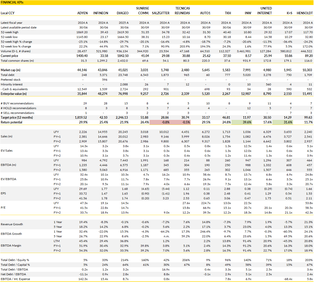 Adyen, Infineon Technologies, Diageo, Sunrise, Salzgitter, Tecnicas Reunidas, AUTO1, TKH Group, INWIT, United Internet Group, K+S, Hensoldt, Stabilus